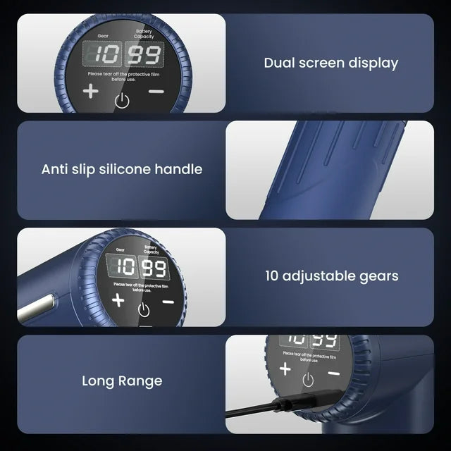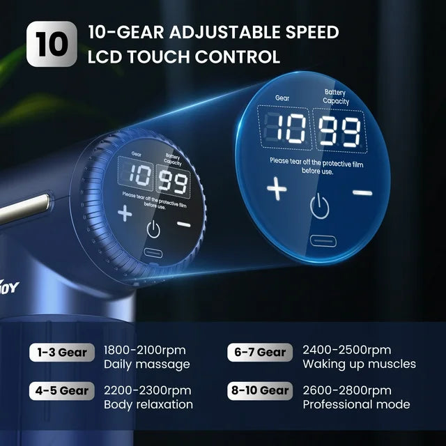 - This cordless electric massager offers 10 different speed levels meet different muscle group, you can adjust the frequency according to the different parts of the massage. Every minute sends high-speed pulse of pressure to your muscle tissue, awake your whole body muscles, provide great deep tissue massage. LED touch screen allows you easily change the speed as you wish.