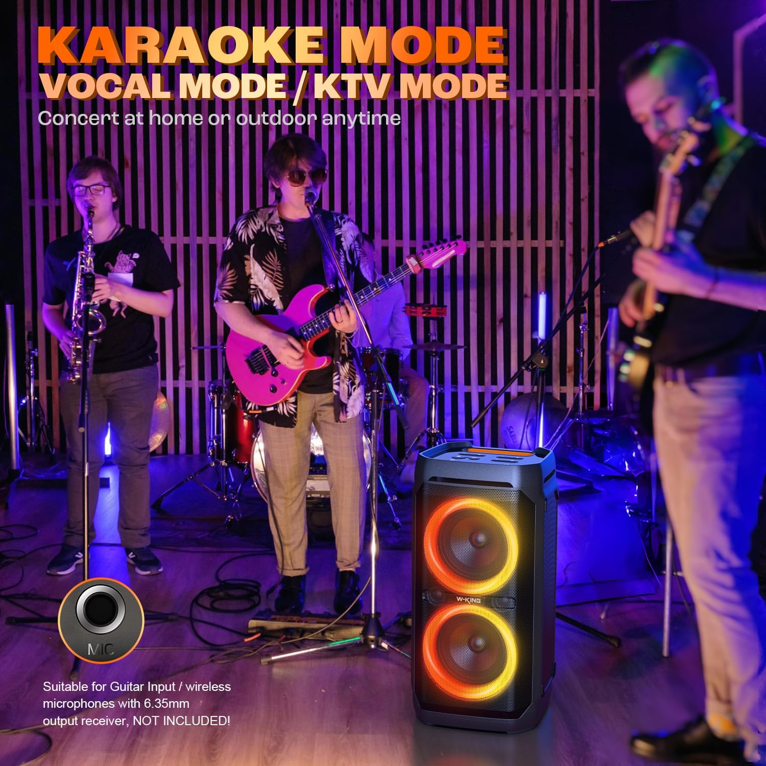 - Mic and Guitar Input: T11 party portable speaker supports input of instruments with 6.35mm jack such as guitar/MIC (only dynamic microphone). It is also suitable for wireless MIC with a 6.35mm output receiver( NOT INCLUDED). Note: When using the this function, please press the ECHO “ -” button to adjust it to 0. T11 party outdoor speaker has its own MIC/GUITAR volume control and MIC ECHO adjustment buttons. you can adjust the vocals and timbre of the mic/guitar according to your own preferences