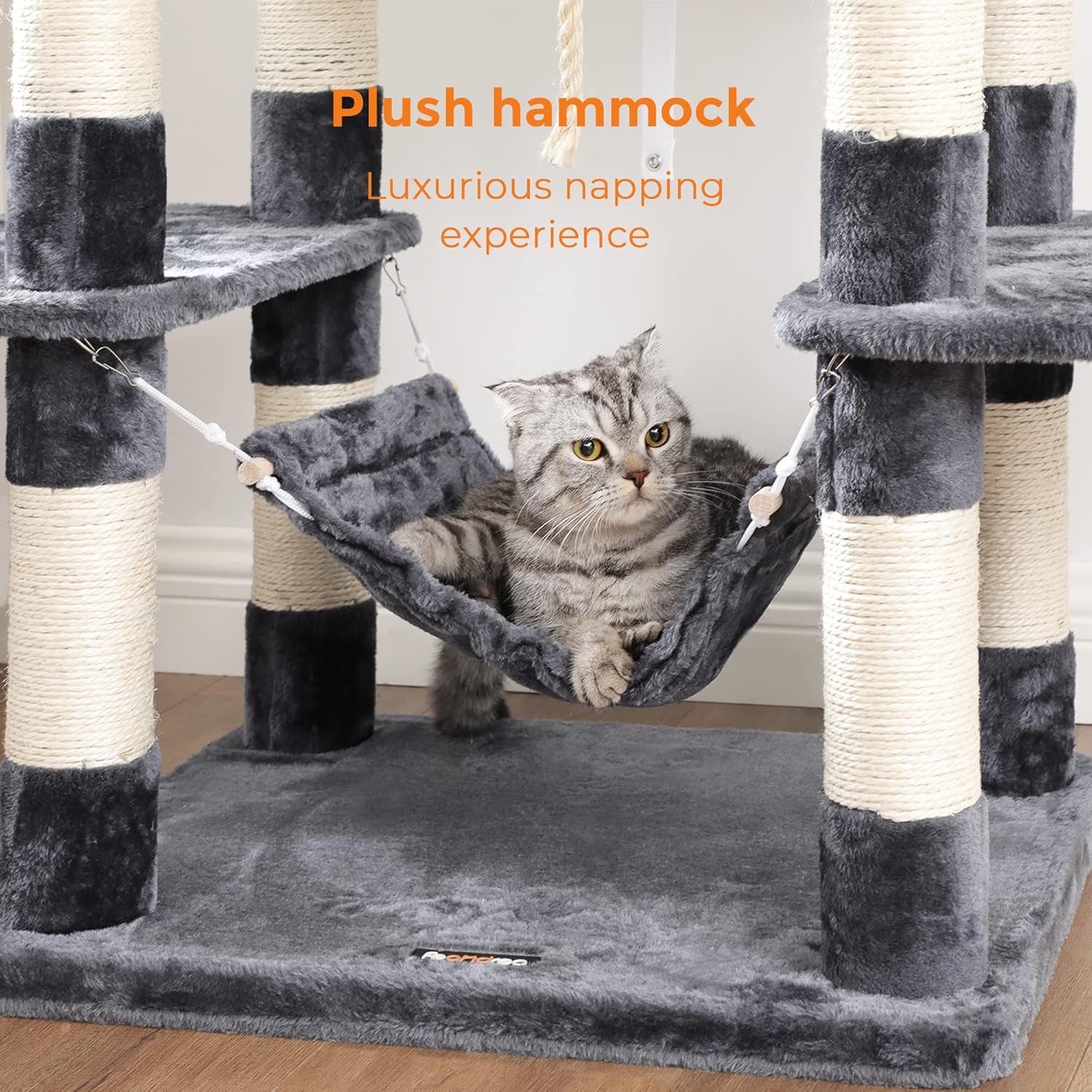 - All-in-One Relaxing Spot: Roomy condo and plush hammock offer luxurious napping experience; top perches with raised edge allow your cat to rest on its head while watching over the house