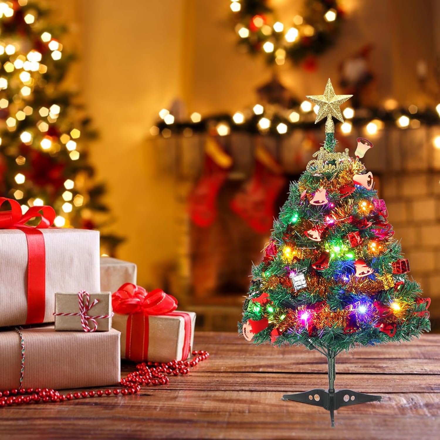 Mini Christmas Tree, 2ft Tabletop Christmas Tree Small Christmas Tree with Lights, Hanging Ornaments and Star Treetop, Christmas Decoration Tree Decor