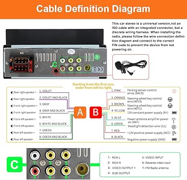- 【Important Notes】3.Ensure the red wire is connected to the ACC (car key fob) properly to make sure the single din car stereo turns off when the car is off, preventing it from staying on when the car is not running. 4.Make sure to insulate all wires correctly to prevent the positive and negative terminals from touching, avoiding short circuits or other safety hazards. 5.This single din car stereo works with 12-14.4V DC voltage, Max 15A. It can't be used for big trucks with 24V.