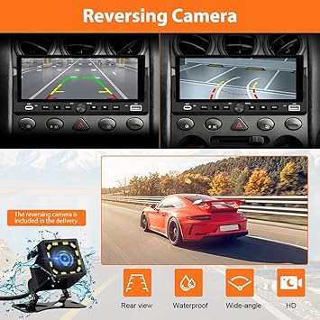 - 【Waterproof HD Backup Camera and RCA output】Enhance parking safety with a ultra-wide-angle, waterproof HD backup camera that delivers clear 1080P night vision, even in low-light or rainy conditions. The system automatically switches to the rear view when reversing, making parking easier and safer. Supports RCA output, ensuring seamless integration with your car stereo.