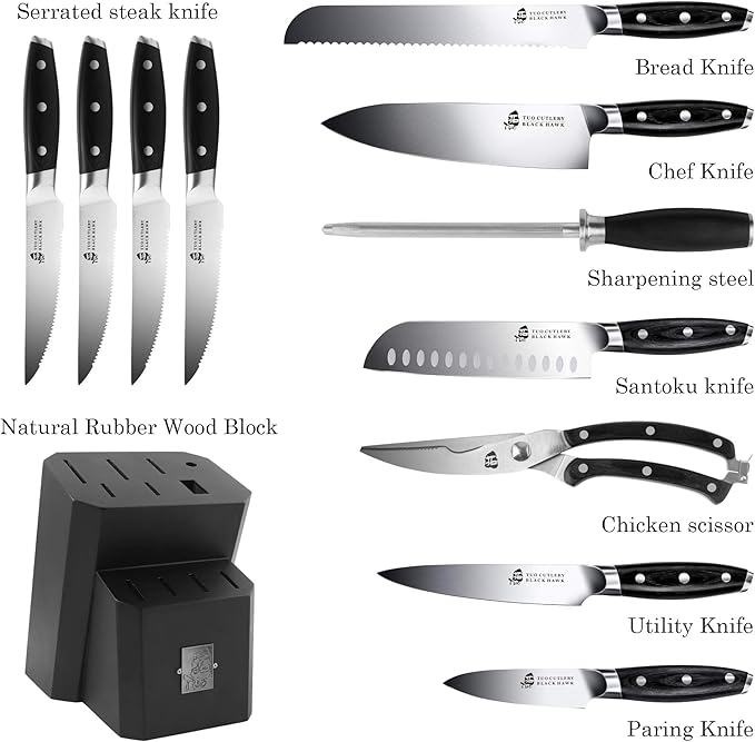 - SPECIALIZED KITCHEN PARTNER: The Black Hawk Knife Set can support your preparation work in the kitchen. They can not only be used for cutting, dicing and slicing meats, but also for dinning, such as cutting bread & steak and fruits, allowing you to enjoy cooking at any time.
