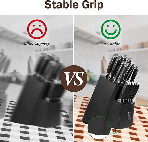 - 🍈 SAFETY & HEALTH: All knives can be stored in wooden blocks, which not only saves space but also ensures that each knife is safely in place. Natural rubber wood also can protect the knives from contamination. While preparing a delicious meal, you can directly use the knives you need.