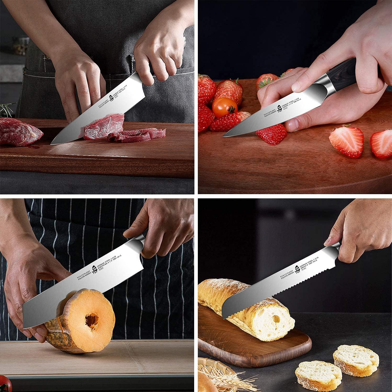 - 🍈 RAZOR-SHARP EDGE: Forged German high-carbon stainless steel by exclusive technology to achieve high hardness of HRC56±2. Each blade is hand polished to achieve better sharpness and edge retention, suitable for cutting a variety of soft or hard foods. This kitchen knife set allows you to easily handle all kinds of ingredients.