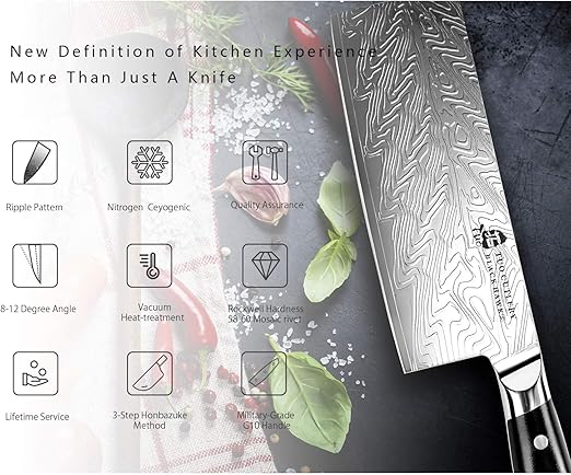- ✅HIGH-STANDARD CRAFTSMANSHIP: Our experienced kitchen knives smiths hand sharpen the screamingly sharp edge with traditional Honbazuke method to be 8-12 degree per side.Our state-of-the-art technique and facility balance the contradictory relationship between malleability and hardness of the steel precisely. The handle is made of G10 fiberglass composite materials that feature superior lasting properties. It is nearly immune to extreme temperature or humidity.