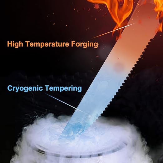 - FOOD GRADE STEEL: Forged from high-quality German stainless steel, after high-tech vacuum heat treatment and nitrogen cooling, the hardness is increased to 56±2 HRC, making the dinner knife more wear-resistant, durable and rust-resistant.
