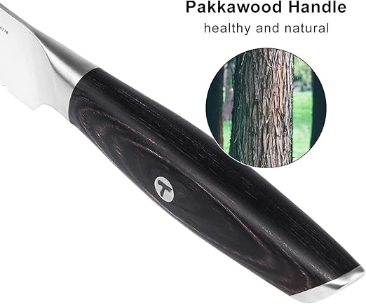 - Fine Grinding Knife Edge: TUO insist on the handmade fine grinding V edge (8-12°), keeping the finest cutting feeling, while taking the strength of the edge into account, maintaining a perfect balance between sharpness and elasticity, thus the sharp blade leave a flat cut surface on steaks.