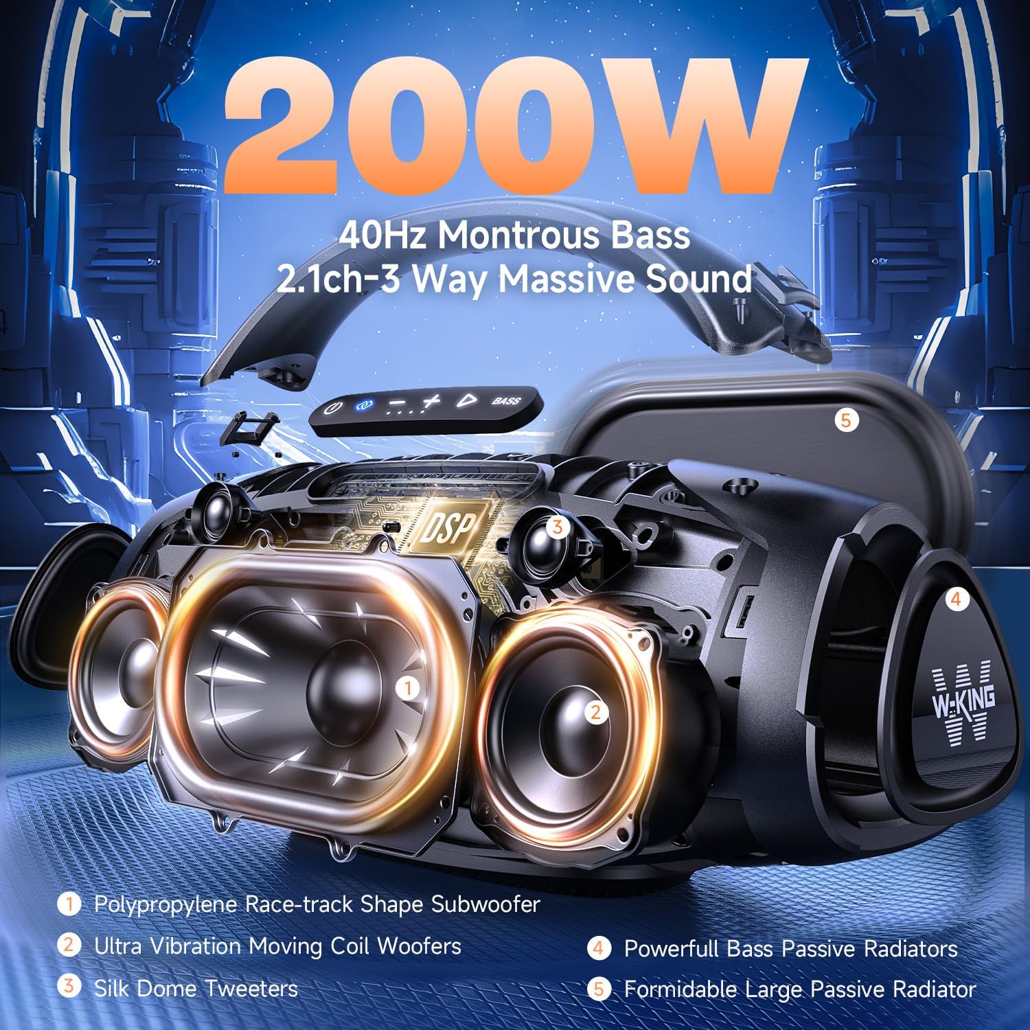 W-King Bluetooth Speaker X20, 330W Peak 200W RMS Portable Wireless Speaker with 7.5" Subwoofer, 40Hz Massive Bass, EQ APP, 2.1Ch, IPX7, BT5.4, Stereo Pairing, OTG, Boom Box for Party, Outdoor, Beach