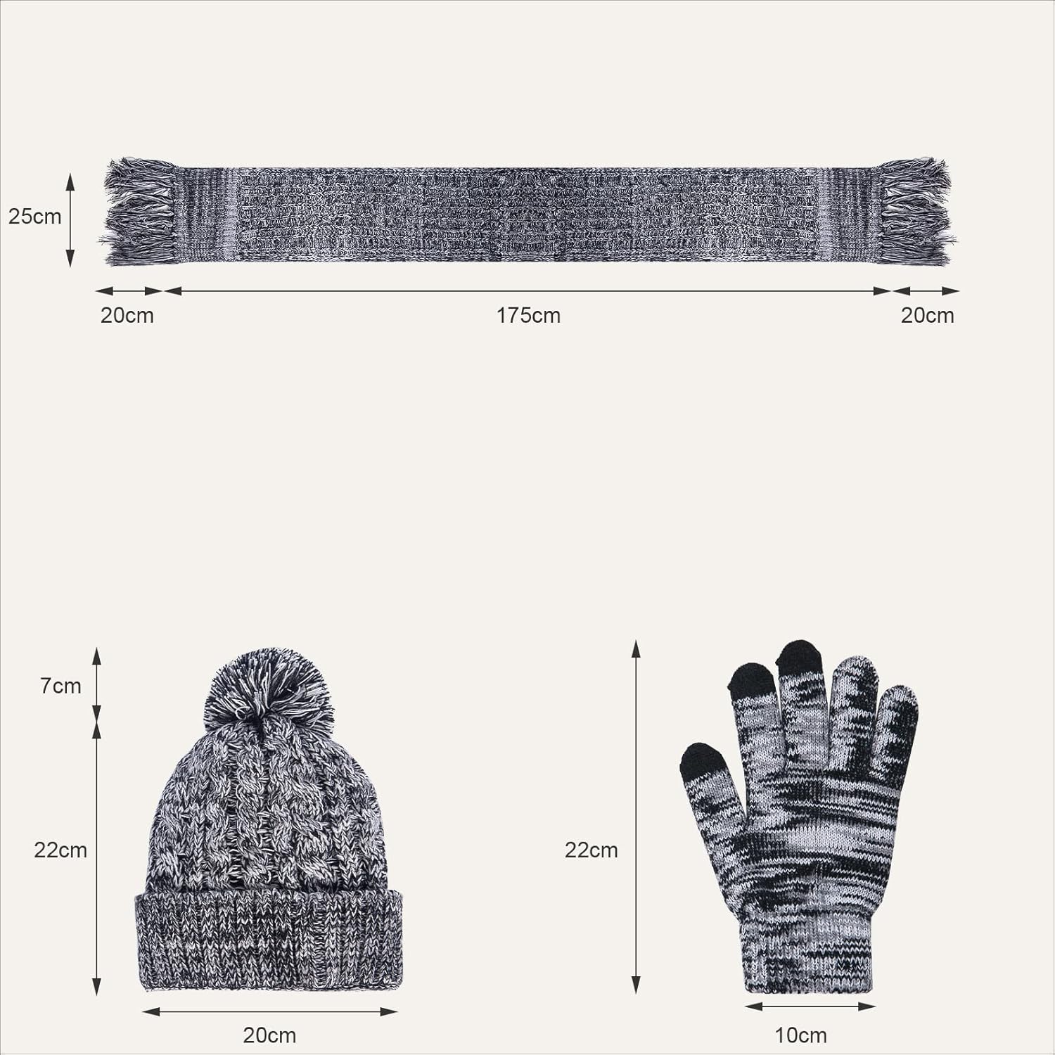- Perfect Gift: Our knitted hat set dimensions are: Hat: 8.6" x7.8"INCH(195CMx25CM) Scarf: 77.9"x9.8" (22CMx20CM) Gloves: 8.6"x 3.9" (22CMx10CM).This is a super warm and practical women's hat, scarf and glove set, which will never fail in winter,women's warm beanie set are ideal to give as a gift this festive season