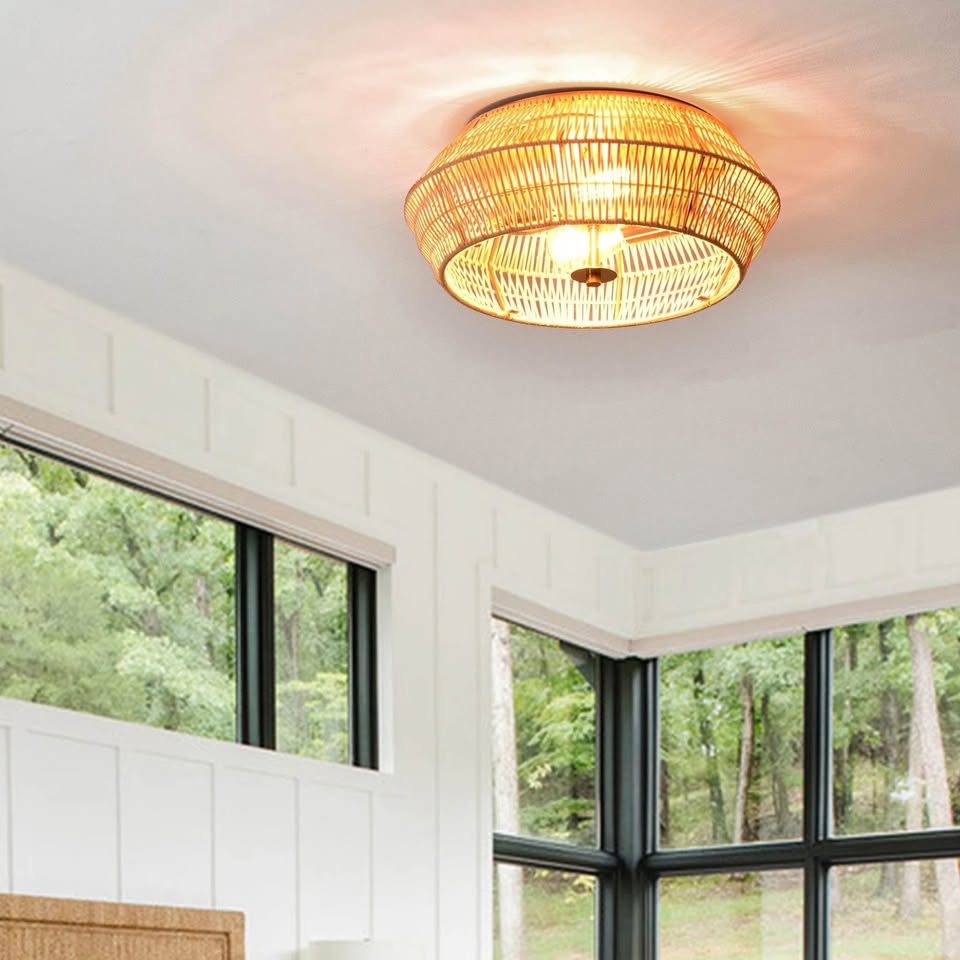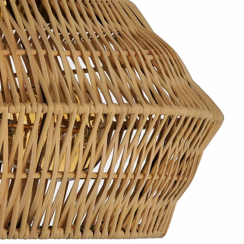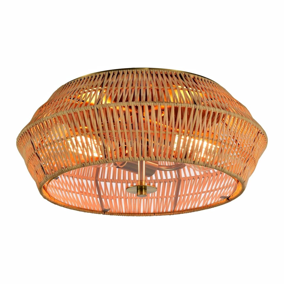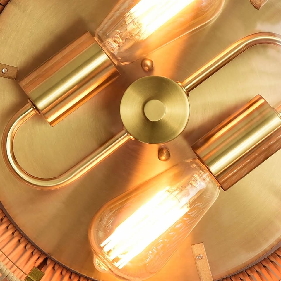 这款吸顶灯采用传统工艺精湛编织而成,天然藤条手工编织成几何笼状外壳,底部配有钢化透明玻璃漫射器。灯罩采用复古黄铜饰面金属材质,并配有两个复古灯座。这款灯具质感自然,照明效果柔和,适用于各种生活空间。