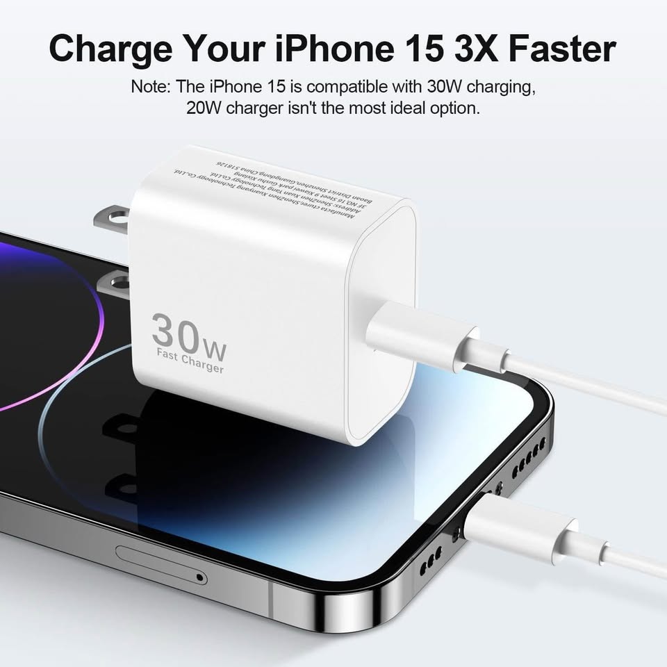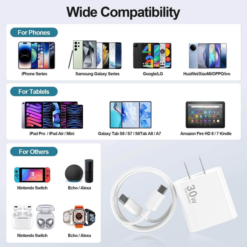 每套包含一个 30W 适配器 + 一根 6.6 英尺长的电缆——非常适合家庭、办公室或旅行使用。
