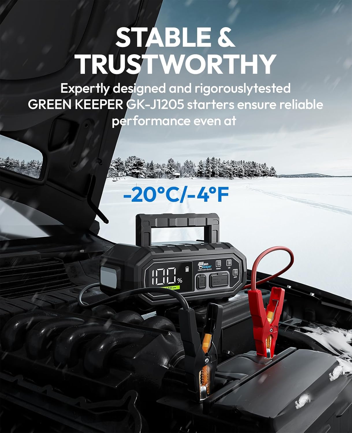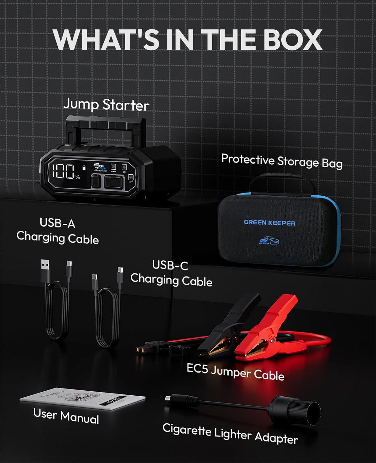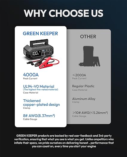 - 多功能应急工具:Green Keeper 汽车应急启动器是一款功能强大的便携式汽车应急启动器,峰值电流高达 4000A,专为 10.0L 汽油和柴油发动机设计。它非常适合极端天气条件和紧急情况,确保每次都能可靠启动车辆。