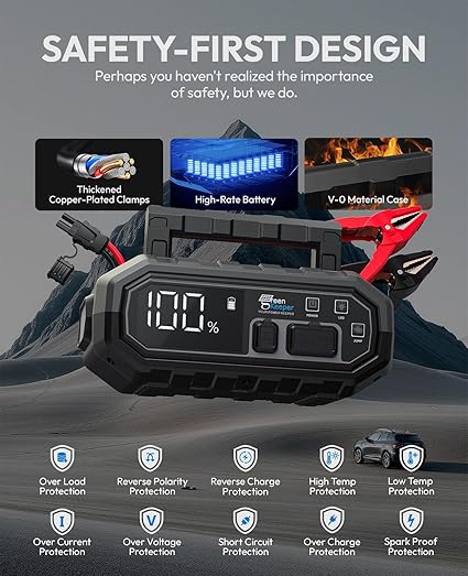 - 先进的安全功能:配备智能保护系统,确保安全启动。功能包括防火花、反极性保护和自动断电,让您安心无忧。
