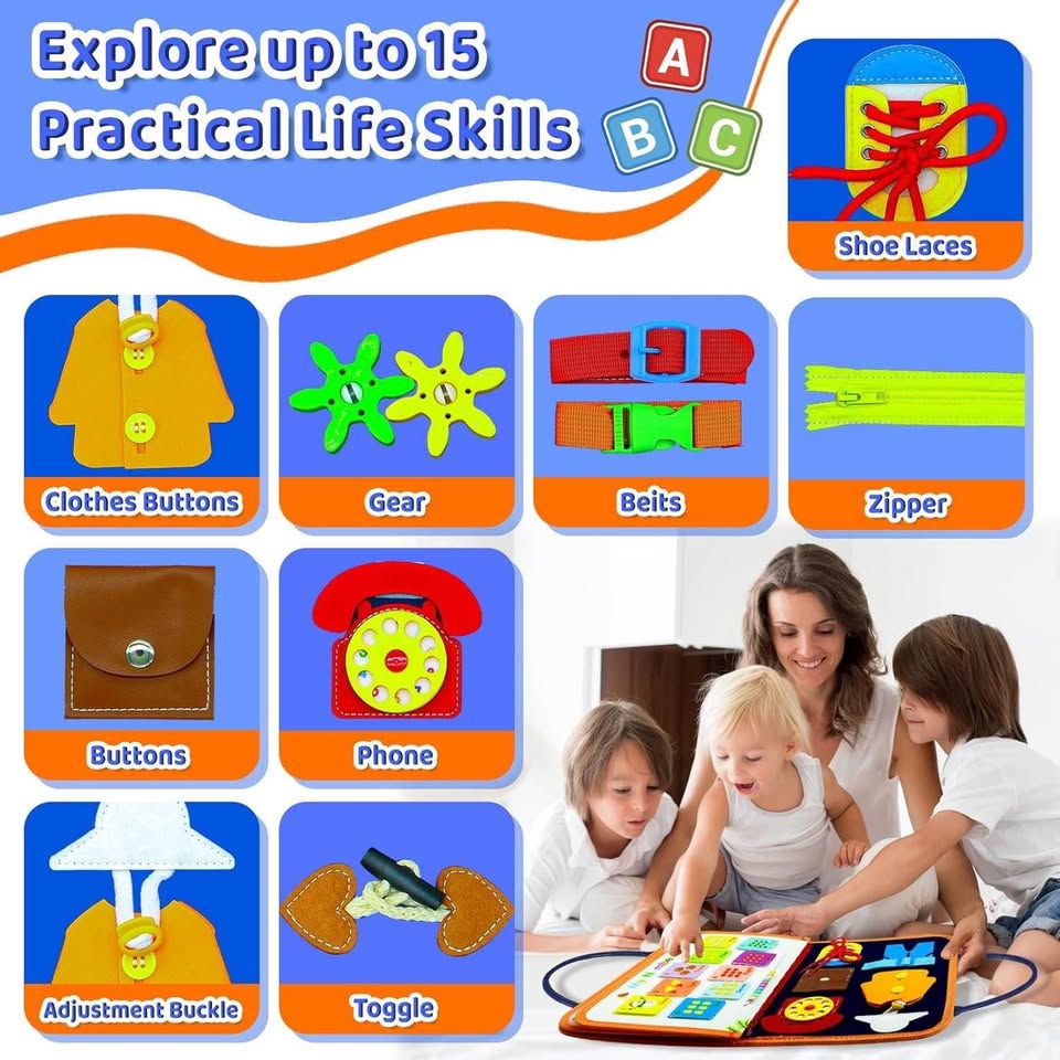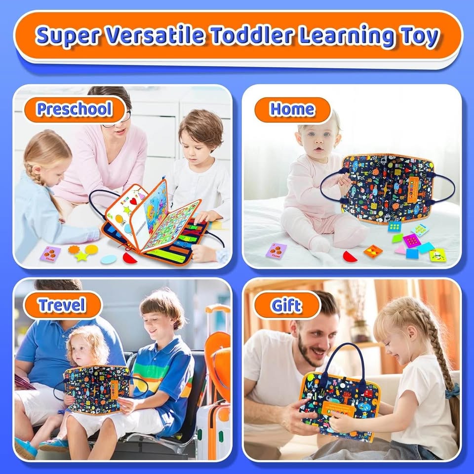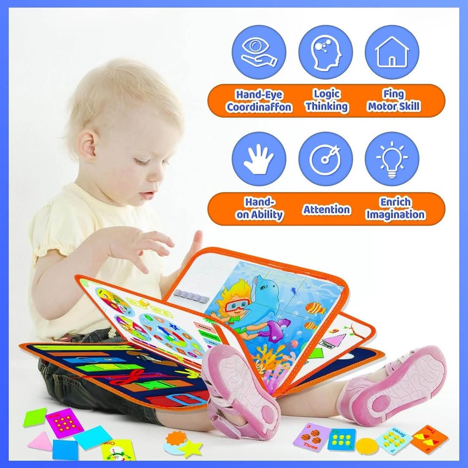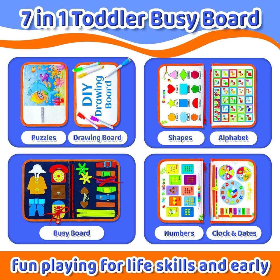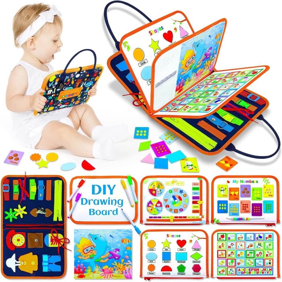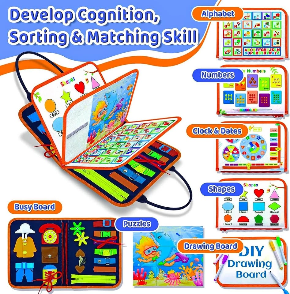 【幼儿忙碌板】如果您正在为您的幼儿寻找益智玩具,那么这款蒙特梭利感官忙碌板玩具就是您的理想之选。我们的蒙特梭利忙碌板提供丰富多彩的活动,包括生活技能、字母、数字、天气、形状、颜色、拼图、DIY绘画板和穿衣技能。它可以模拟基本的生活场景,帮助您的孩子发展基本技能。它能让您的幼儿保持专注,并乐于探索和玩耍。【蒙特梭利玩具忙碌板】这款蒙特梭利玩具是感官学习的完美补充,也是一款寓教于乐的玩具!它能增强孩子的创造力和批判性思维能力。这款忙碌板适合1-4岁的幼儿,是任何儿童床或游戏室的完美补充,保证让您的孩子在成长过程中保持专注和挑战。【耐用便携】采用柔软的羊毛毡和ABS材料制成,色彩鲜艳,所有部件都牢固连接,其完美的尺寸和便携设计使其成为旅行的理想之选。这款忙碌板能让您的孩子在学习和探索世界的同时,享受数小时的娱乐时光。【提升生活技能和批判性思维】这款幼儿忙碌板是一款专为1-4岁儿童设计的蒙特梭利感官玩具。它包含19个有趣的穿衣和学习游戏,能够促进孩子的手眼协调能力和灵活性,并鼓励他们进行批判性思考。【寓教于乐的礼物】无论您是在寻找生日礼物、节日礼物,还是仅仅想为孩子寻找一款能够帮助他们学习和成长的玩具,这款幼儿忙碌板都是绝佳之选。这款蒙特梭利玩具专为男孩和女孩设计,能够帮助孩子培养必要的技能。因此,这款忙碌板非常适合作为寓教于乐的礼物、生日礼物、复活节礼物和圣诞节礼物。