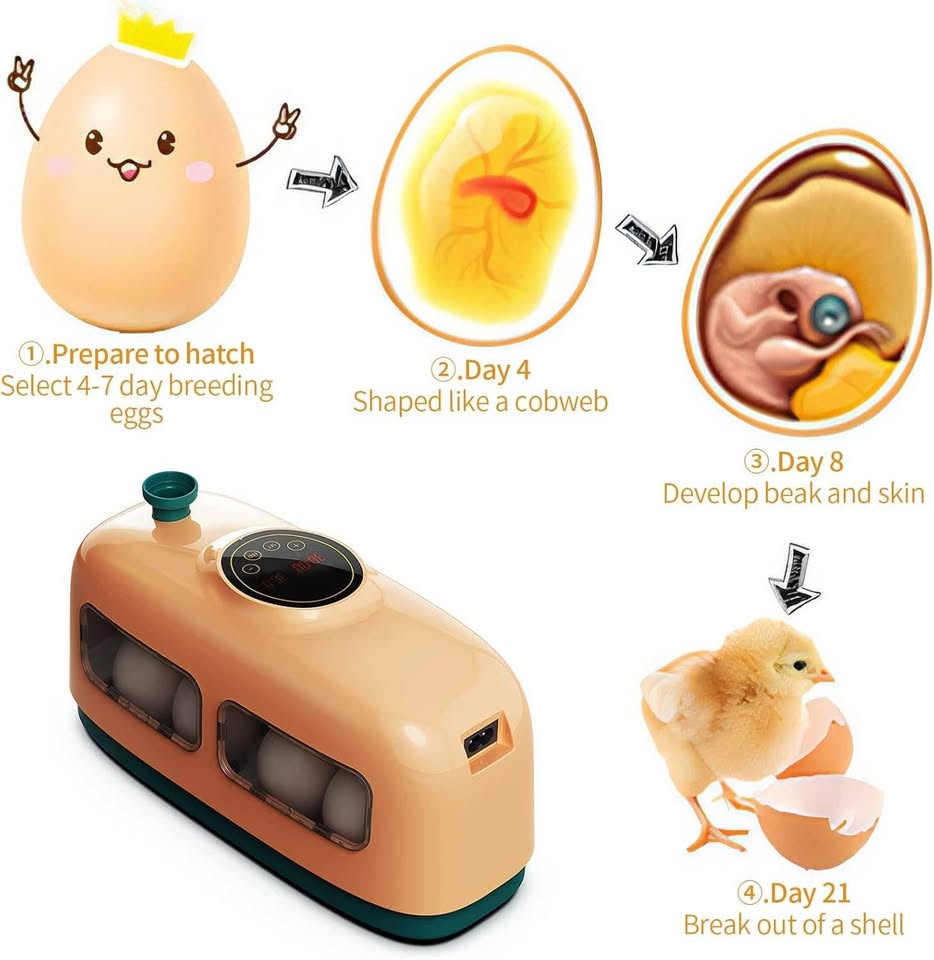 优质材料:孵蛋器采用PP和ABS材质,经久耐用,坚固可靠,可长期使用。采用智能技术,使用起来毫不费力。将新鲜鸡蛋(母鸡产下后3-7天)放入孵蛋器,鸡蛋的细端朝下放置,每天翻蛋2-3次,直到鸡蛋孵化(约20天)。