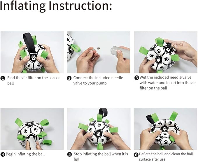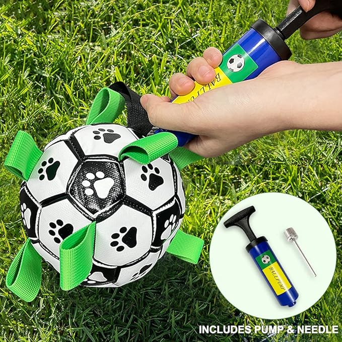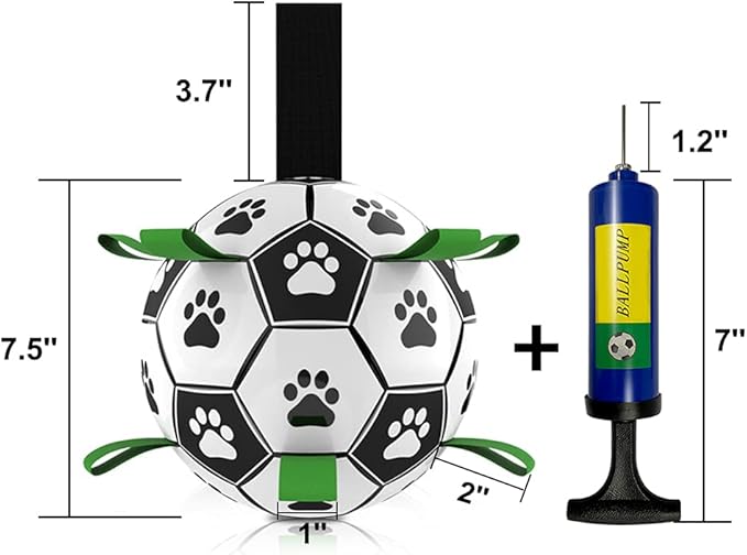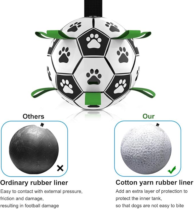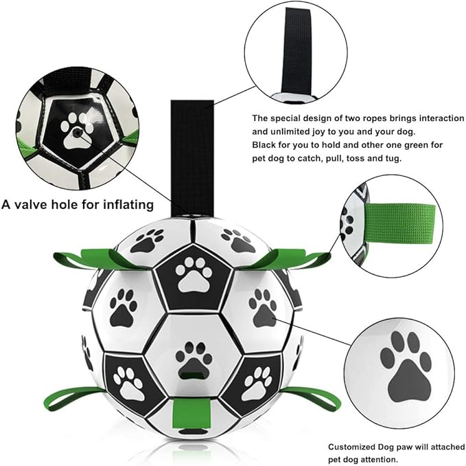 - 【独特的抓握拉片设计】足球接缝处设有9个尼龙拉片(包括1个长黑色手绘拉片,方便您抓握;以及8个短绿色拉片,方便宠物狗咬合)。让您的宠物更容易拉、扔、拖足球。您可以和狗狗互动玩耍。