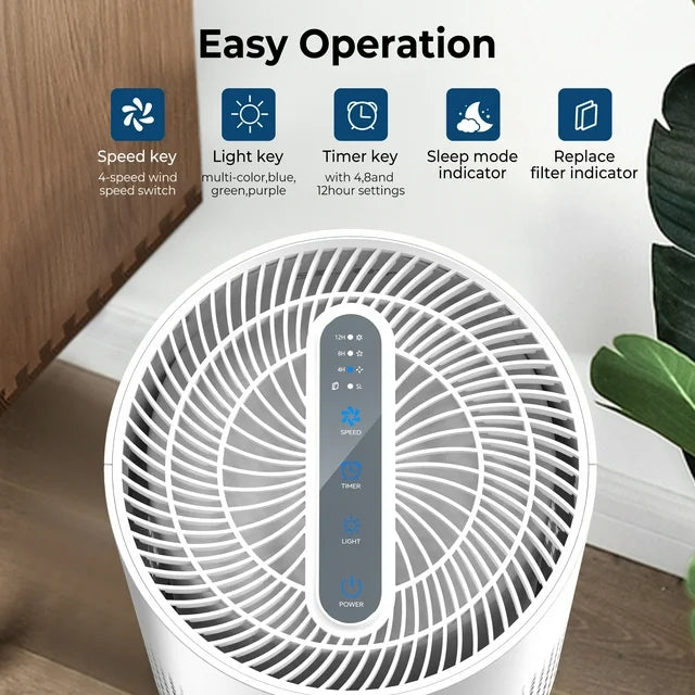 - 触摸屏,用途广泛:智能触摸屏按钮,具备速度控制、睡眠模式、4小时/8小时/12小时定时器、滤网更换指示灯和照明灯功能。家用高效空气净化器,现代设计,适合各种空间,从小房间到大房间均可使用,适用于卧室、客厅、办公室、婴儿房、厨房和地下室。
