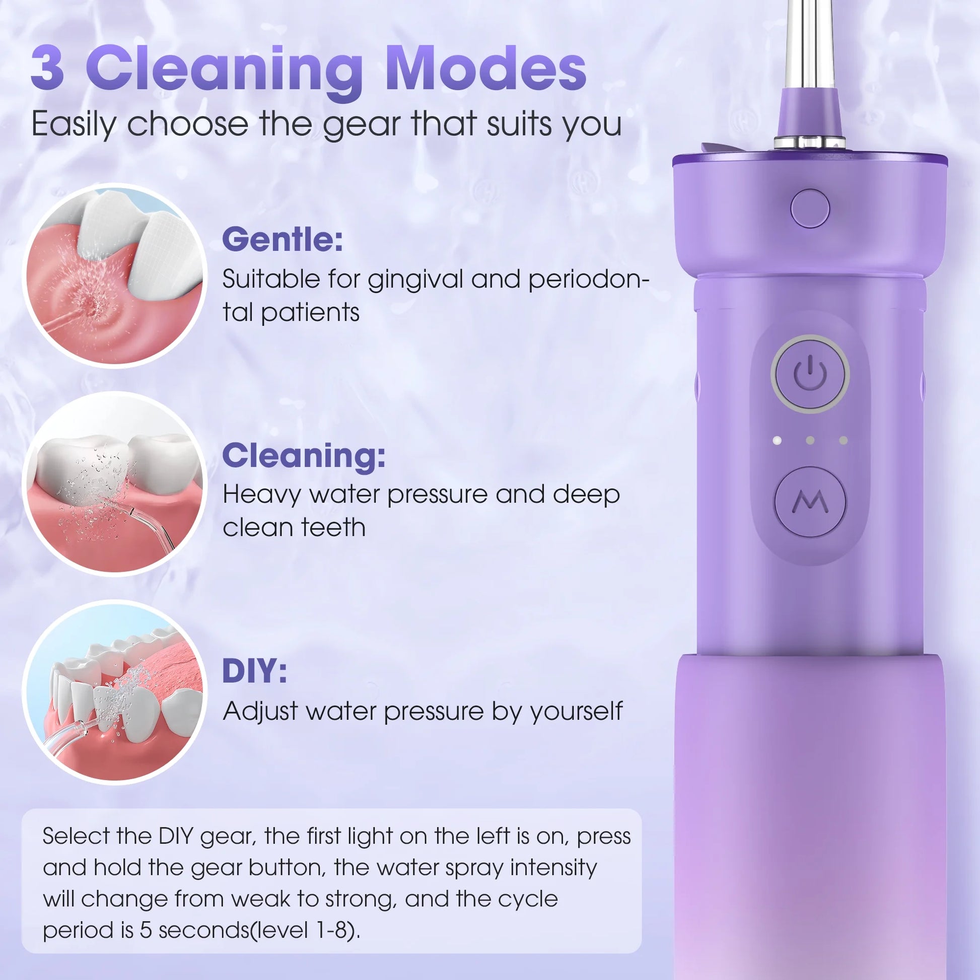 便携式冲牙器具有2分钟定时器、档位记忆功能、电池电量提醒功能和三种模式。DIY模式——您可以自定义模式(70PSI-130PSI),适合每个人找到舒适的水压。 轻柔模式(100PSI)——适合敏感牙齿;清洁模式(130PSI)——深度清洁牙齿残留物,可根据不同的口腔护理需求进行选择。 360°旋转喷嘴 让您轻松清洁难以触及的区域。