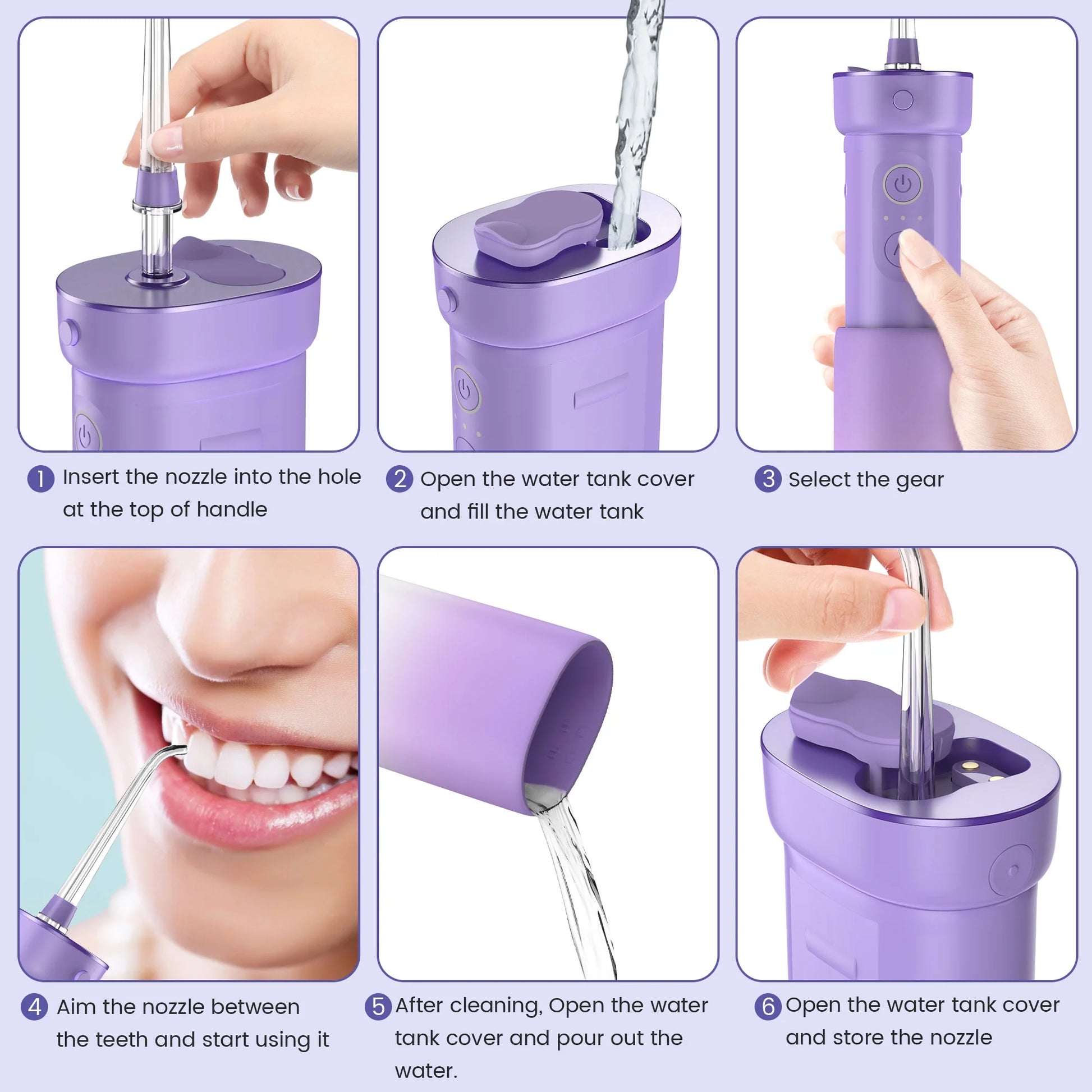 无绳轻巧设计,无论在家还是外出,都能满足您餐后清洁需求;配备 5 个可替换喷嘴(2 个标准喷嘴、1 个舌苔清洁器、1 个正畸头、1 个牙周清洁头,满足不同人群的需求),适合全家使用。