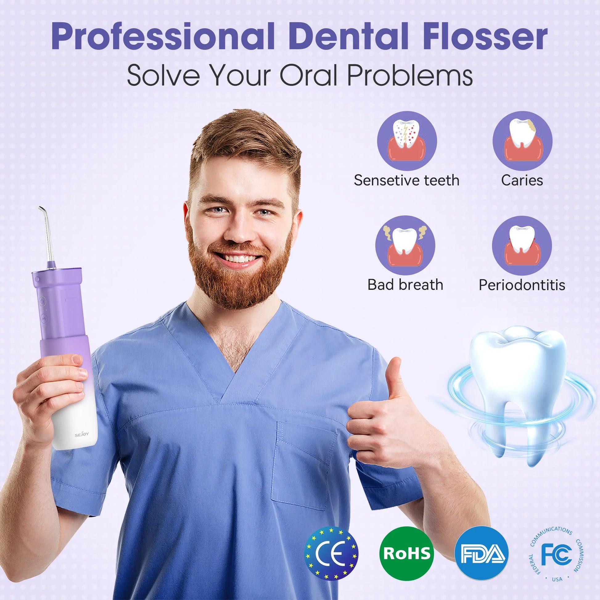 Sejoy冲牙器可提供1500次高压脉冲和130PSI的强劲水压,可去除高达99.9%的牙菌斑,比牙线清洁牙龈的效果高出50%。它还有助于缓解牙龈出血、口臭,并有益于正畸牙套和牙桥的护理。只需将水箱注满温水,将喷头放入口中,即可开始清洁。