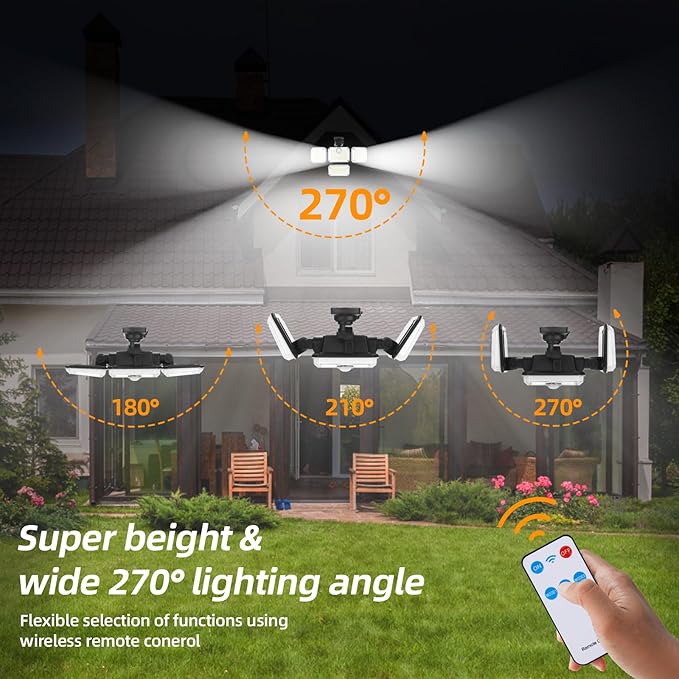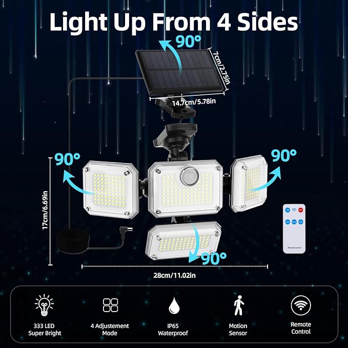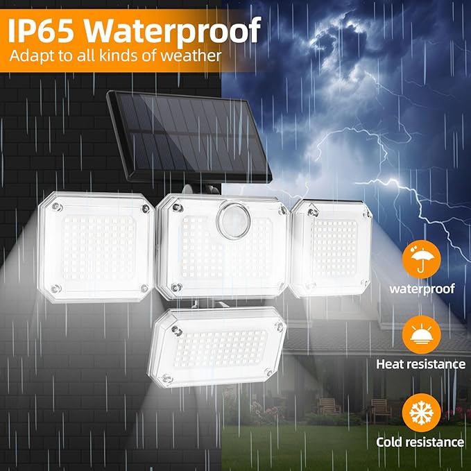 - 【2025新款升级版感应灯】这款四头太阳能灯配备333颗超亮LED灯珠,亮度高达3600流明,发出清晰明亮的7000K日光白光。这款多功能户外照明解决方案不仅可以照亮庭院的昏暗角落,还能增强各种活动的可见度,确保道路照明充足,甚至在夜间外出时也能为宠物提供更多便利。