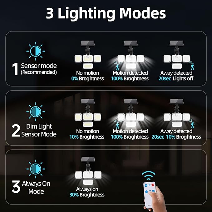 - 【3种照明模式 & 遥控器】每盏太阳能人体感应灯都配备无线遥控器,方便快捷地选择模式。您可以根据自己的喜好定制照明体验,例如①强光感应模式、②弱光感应模式和③强光常亮模式。多种照明模式轻松满足您的日常需求。
