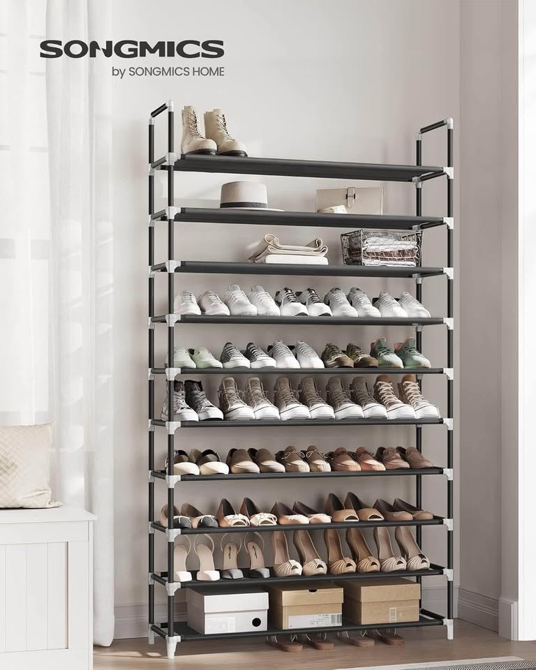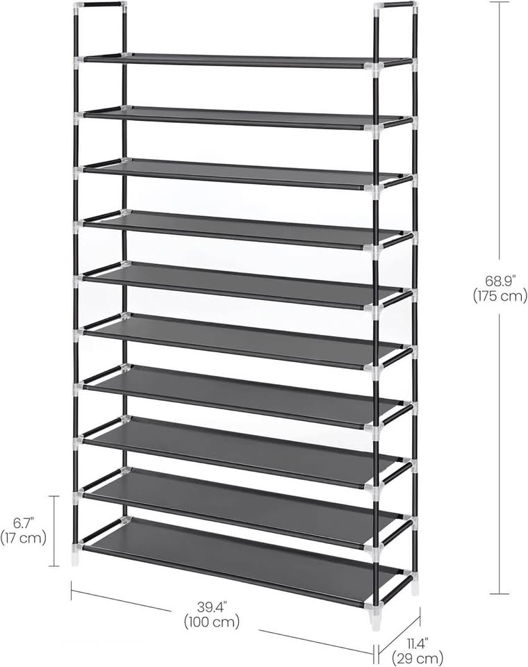 SONGMICS 10层鞋架,适用于走廊壁橱的鞋子收纳架,纤薄节省空间,金属框架,无纺布层板,黑色