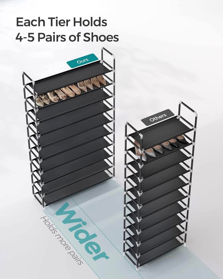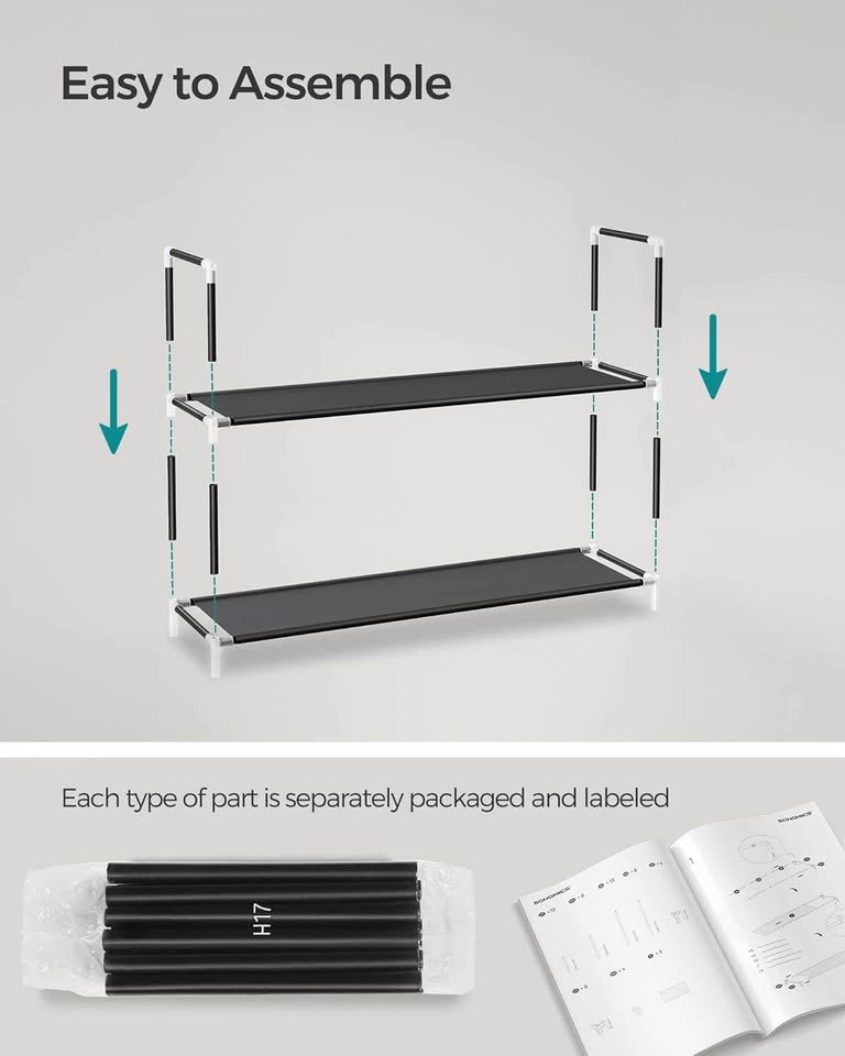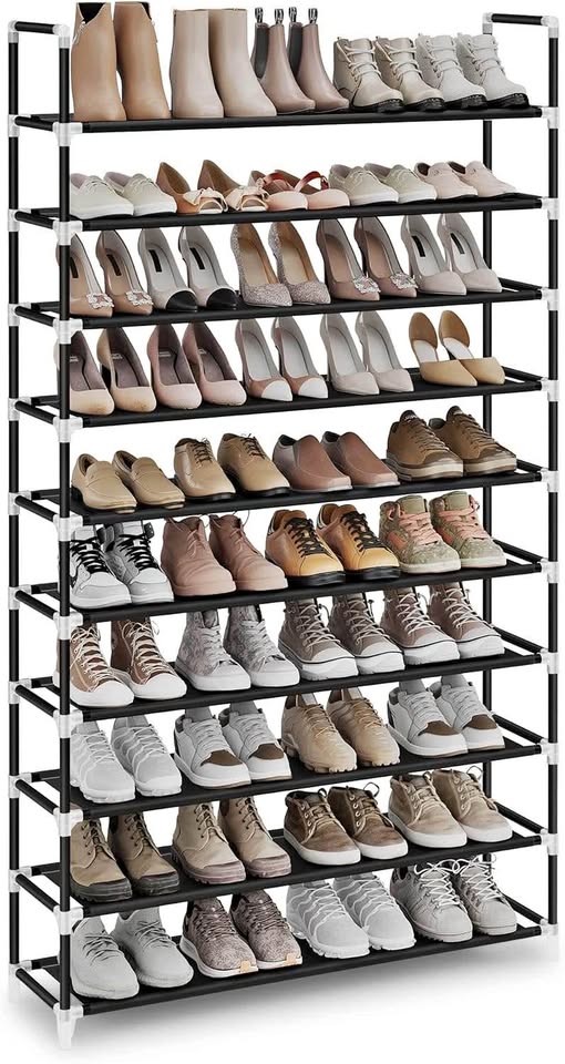 【每双鞋都能找到合适的空间】这款鞋架长100厘米,每层可轻松放置4-5双鞋,总共可容纳40-50双。层间距17厘米,方便您收纳各种鞋款,从运动鞋到高跟鞋皆可。【组装便捷】所有部件均分装在不同的包装袋中,并贴有标签,附带清晰的说明书,让您轻松快速地组装这款10层鞋架。【轻巧坚固】鞋架采用无纺布层板、金属管框架和坚固的塑料连接件,轻巧而坚固,每层可承重高达5公斤。【节省空间】这款纤细的立式鞋架可最大限度地利用玄关或衣橱的储物空间,同时最大限度地减少占用地面空间,是小户型的理想之选。【易于清洁和移动】只需用湿布擦拭即可清洁金属或织物。轻巧的设计让您轻松移动鞋架,变换摆放位置。