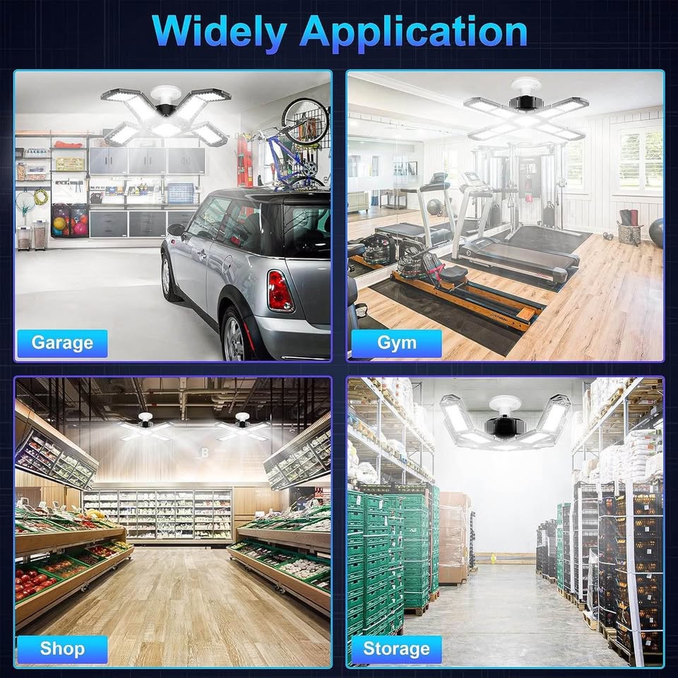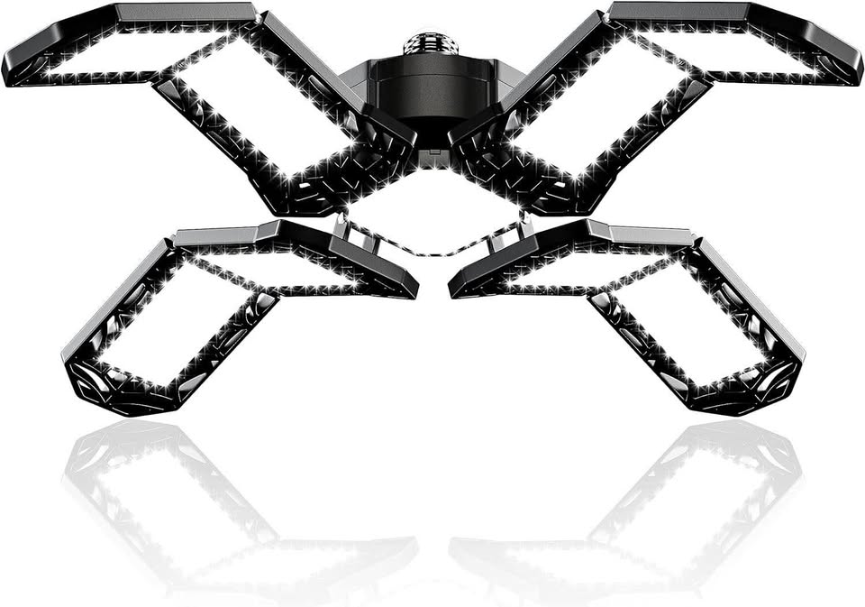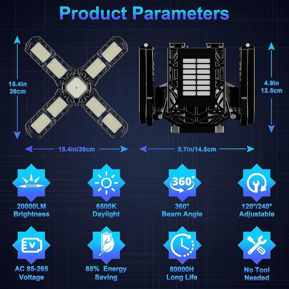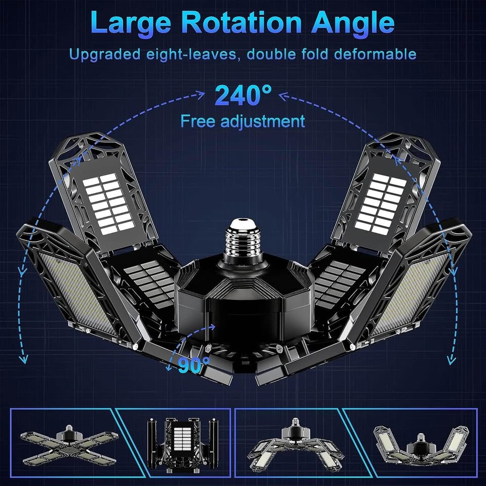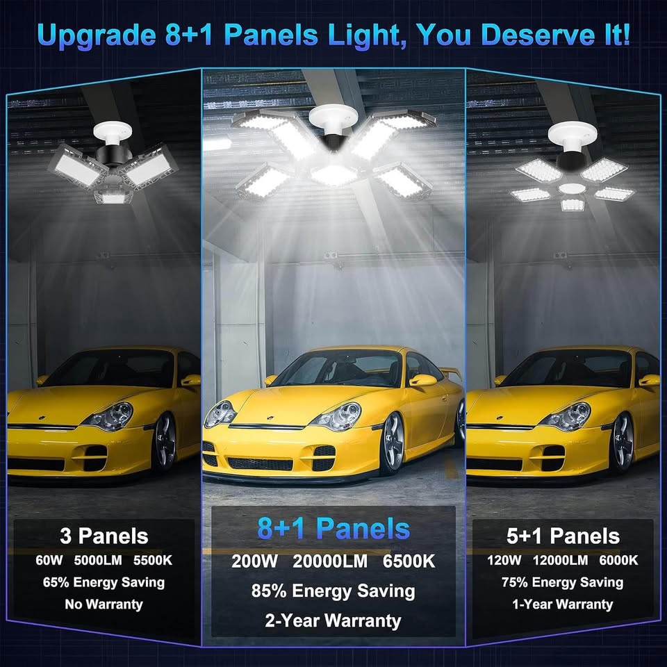 超亮LED车库灯 - 200W 20000流明,可变形E26/E27螺口吸顶工作灯,带8+1个可调节面板,适用于车间和地下室的商业照明